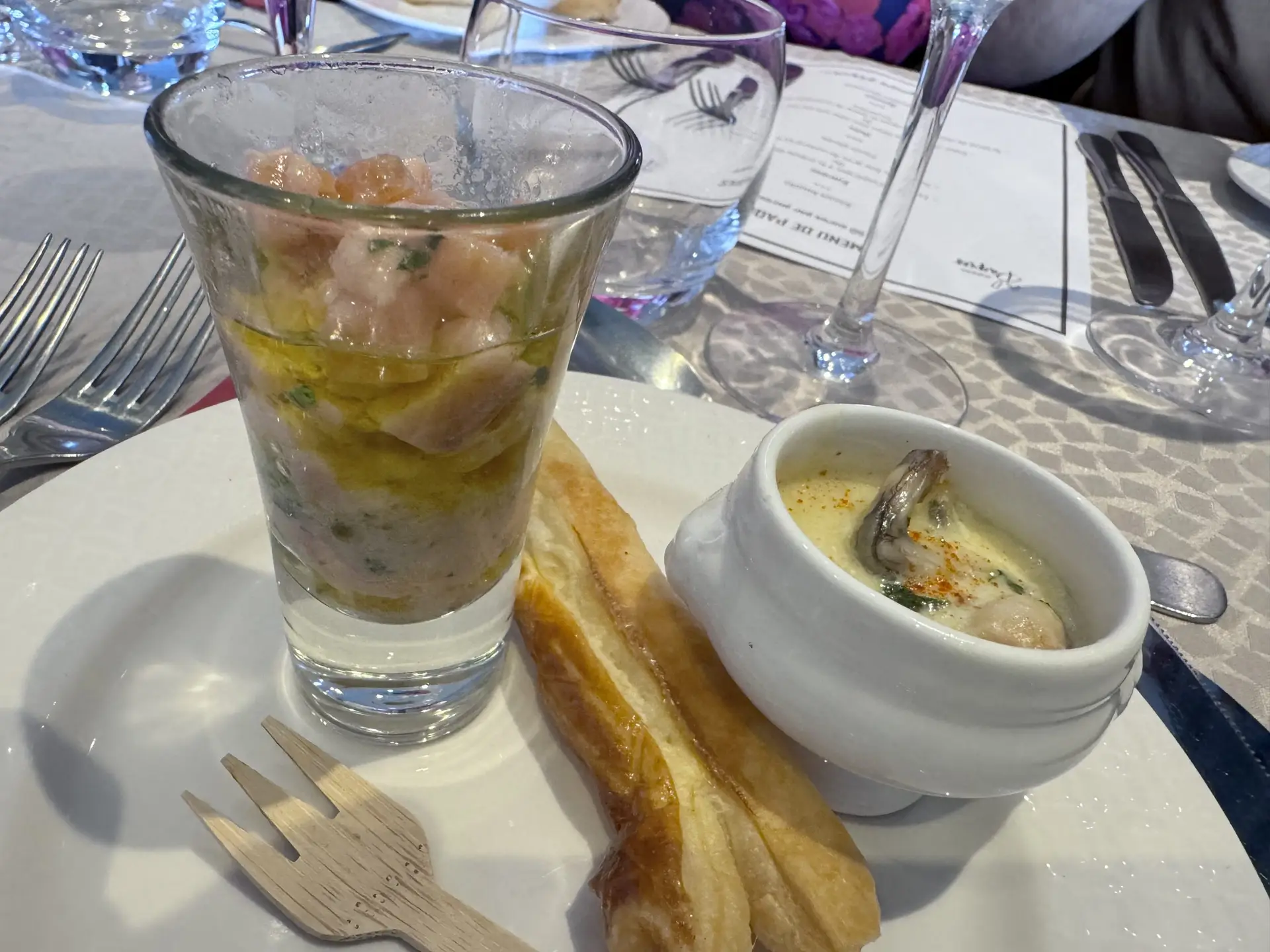 Saint-Jacques Marinées, saumon confit ou fumé (selon saison), brochettes de crevettes sauvages