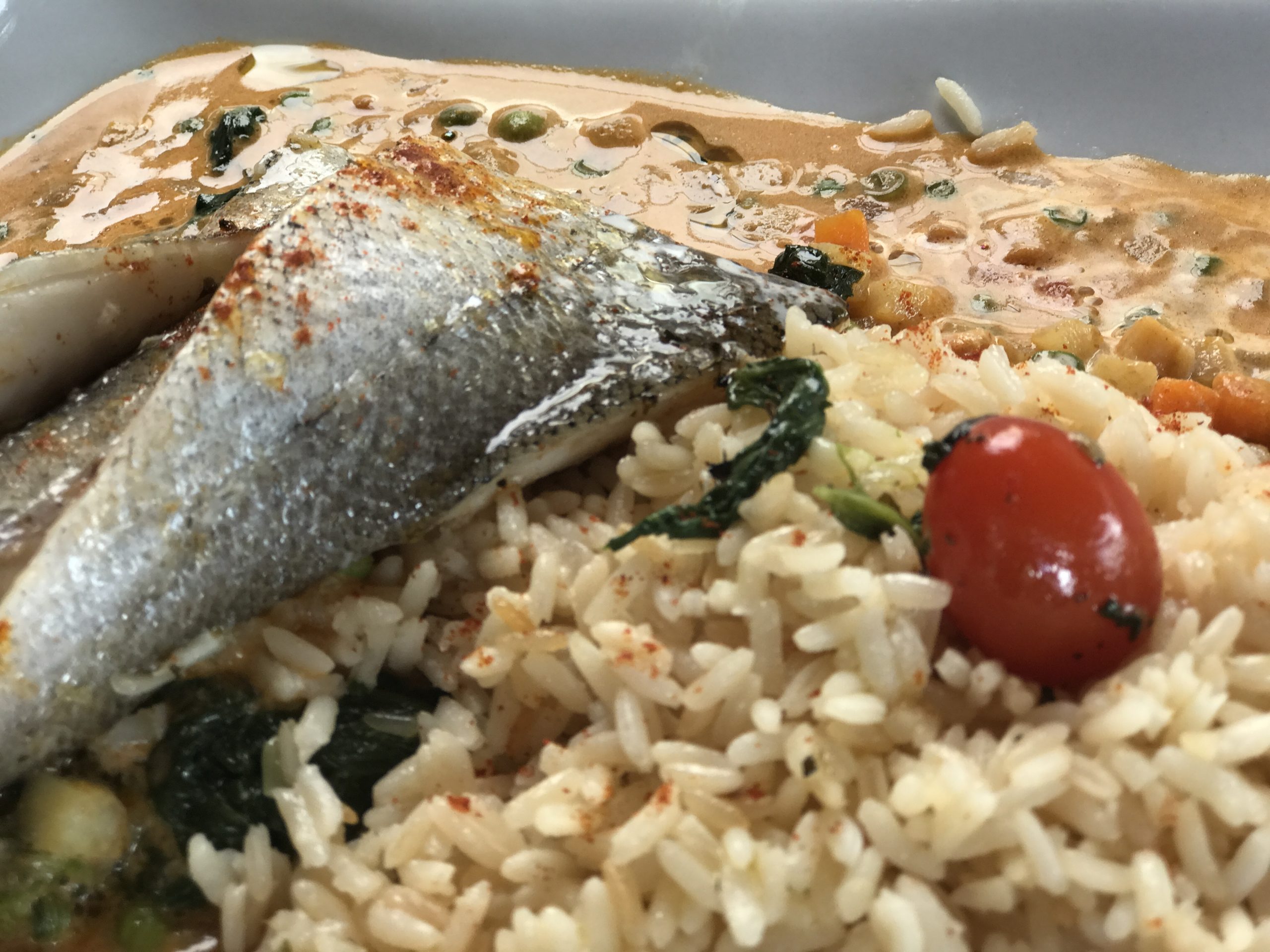 Dorades, crevettes sauvages, moules, poulet chorizo calamar